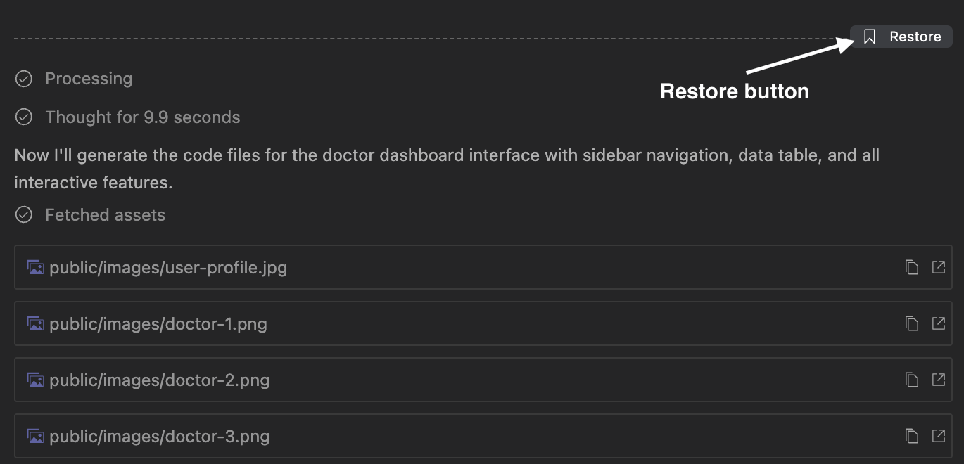 Kombai provides a restore button at certain checkpoints: after generating the plan, before auto-fixing the errors, before a follow-up input.